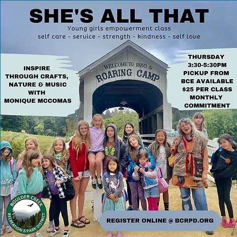 Boulder Creek Recreation 15685 Forest Hill Drive, Boulder Creek, CA, United StatesShe's All That Mondays, starting March 4 Last chance to sign up for the 2nd half of She's All That, young women's empowerment class. https://bcrpd2.wufoo.com/forms/z1w272r41anulu0/ NO CLASS: April 1, April 8, April 22 or May 13 Instructor: Monique McComas, sundancer381@comcast.net 2:44pm-5pm Our team will pick up from BCE and walk down to the Rec Center […]